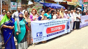 কুমিল্লার মুরাদনগরসহ দেশের বিভিন্ন স্থানে নারী ও শিশু নির্যাতন, ধর্ষণ ও হত্যার প্রতিবাদে রাজশাহীতে মানববন্ধন অনুষ্ঠিত হয়েছে। গতকাল মঙ্গলবার (১ জুলাই) বেলা ১১টায় মহানগরীর সাহেববাজার জিরোপয়েন্টে এ কর্মসূচির আয়োজন করে বাংলাদেশ মহিলা পরিষদের রাজশাহী জেলা শাখা ও বেসরকারি সংস্থা অ্যাসোসিয়েশন ফর কম্যুনিটি ডেভেলেপমেন্ট (এসিডি)। মানববন্ধনে বক্তব্য রাখেন: বাংলাদেশ মহিলা পরিষদের সাধারণ সম্পাদক কল্পনা রায়, সাংবাদিক মোস্তাফিজুর রহমান আলম, রাজশাহী রক্ষা সংগ্রাম পরিষদের সাধারণ সম্পাদক জামাত খান, জাতীয় মহিলা আইনজীবী সমিতির পরিচালক অ্যাডভোকেট দিলসেতারা চুনি,জেলা কৃষকদলের সভাপতি শফিকুল আলম সমাপ্ত, আদিবাসী পরিষদের নেতা সুভাষ চন্দ্র রায় প্রমুখ। এসময় বক্তারা বলেন, দেশের আইন বিক্রি হচ্ছে, বিচার বিভাগ বিক্রি হচ্ছে ফলে বারবার এমন ঘটনার পুনরাবৃত্তি ঘটছে। প্রচলিত আইনেই দ্রুততম বিচারের দৃষ্টান্ত স্থাপন করা গেলে এমন ঘটনা ঘটবে না।এমন অনৈতিক ঘটনা প্রতিহতে সামাজিকভাবেও মানুষের সচেতনতা আরও বাড়ানো দরকার বলে মনে করেন প্রতিবাদকারীরা।#