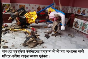 নাটোরের লালপুর উপজেলার হালুডাঙ্গা শ্রীশ্রী মহাশ্মশান কালীমন্দিরের একটি কালীপ্রতিমা ভাঙচুর করেছে দুর্বৃত্তরা। গতকাল সোমবার সন্ধ্যার পর থেকে আজ মঙ্গলবার ভোরের মধ্যে মন্দিরটিতে এ ঘটনা ঘটে। সকালে খবর পেয়ে নাটোরের পুরিশ সুপার মোহাম্মদ আমজাদ হোসাইন, উপজেলা নির্বাহী অফিসার মোঃ মেহেদী হাসান ও থানার ওসি মমিনুজ্জামান সহ সেনাবাহিনীর সদস্যরা ঘটনাস্থল পরিদর্শন করেছেন বলে জানা গেছে। পরে তারা ঘটনাস্থলে যান এবং আশপাশের লোকজনের সঙ্গে কথা বলেন।