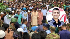 রাজশাহীতে জানাজা শেষে ঢাকার উত্তরায় মাইলস্টোন স্কুল অ্যান্ড কলেজে ভয়াবহ প্রশিক্ষণ বিমান বিধ্বস্তের ঘটনায় নিহত ফ্লাইট লেফটেন্যান্ট তৌকির ইসলাম সাগরকে রাজশাহী মহানগরীর সপুরার জামতলা কবরস্থানে দাফন সম্পন্ন করা হয়েছে। গতকাল (২২ জুলাই) মঙ্গলবার তৌকির ইসলাম সাগরের মরদেহ তার বাসায় পৌঁছে। দুপুর ২টা ৫৫ মিনিটে বিমান বাহিনীর হেলিকপ্টারে তার মরদেহ রাজশাহী ক্যান্টনমেন্টে আনা হয়। সেখানে আনুষ্ঠানিকতা শেষে ৩টা ২০ মিনিটে ক্যান্টনমেন্টের পাশেই নগরীর উপশহরের তিন নম্বর সেক্টরে একটি অ্যাম্বুলেন্সে ভাড়া বাসায় তার মরদেহ নিয়ে যান সেনা ও বিমান বাহিনীর কর্মকর্তারা। এ সময় শত শত উৎসব মানুষ বাড়ির সামনে ভিড় করেন। কান্নায় ভেঙে পড়েন স্বজনেরা। এরপর বাড়ি থেকে তার মরদহ জেলা মুক্তিযুদ্ধ স্মৃতি স্টেডিয়ামে নেওয়া হয়। বিকেল ৪টায় রাজশাহী জেলা স্টেডিয়ামে তার জানাজা অনুষ্ঠিত হয়। এরপর তাকে গার্ড অব অনার প্রদান করা হয়। বিকেল সাড়ে ৪টায় রাজশাহী নগরীর সপুরা শাহী কবরস্থানে তাকে দাফন করা হয়। নিহত তৌকিরের গ্রামের বাড়ি চাঁপাইনবাবগঞ্জ জেলার শিবগঞ্জের কানসাটে। তার এমন বিদায়ে পরিবার ও স্বজনদের মধ্যে শোকের ছায়া নেমে এসেছে। উল্লখ্যে, সোমবার (২১ জুলাই) দুপুরে রাজধানীর উত্তরায় মাইলস্টোন স্কুল অ্যান্ড কলেজের একটি ভবনে বিমানবাহিনীর একটি প্রশিক্ষণ বিমান বিধ্বস্ত হয়। এতে বিমানের পাইলট ফ্লাইট লেফটেন্যান্ট মো. তৌকির ইসলামের মৃত্যু হয়। এ ঘটনায় স্কুলের শিক্ষার্থীসহ এখন পর্যন্ত ৩১ জনের মৃত্যুর খবর জানিয়েছে আইএসপিআর।#