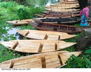বরিশালের আগৈলঝাড়ায় বর্ষা মৌসুমে বিলাঞ্চলসহ সবখানে চলাচল, জীবিকা ও পণ্য পরিবহনের অন্যতম বাহন হচ্ছে নৌকা। পানি হওয়ার আশংকায় নৌকা কেনার ধুম পরেছে নিম্নাঞ্চল এলাকার লোকজনের মধ্যে। দরিদ্র জনগোষ্ঠি অধ্যুষিত যেসব অঞ্চলের মানুষ জীবন জীবিকার প্রয়োজনে নিবিরভাবে নিজেদের জড়িত রেখেছেন মৎস্য শিকার করে তারা বাজারে মাছ বিক্রির মাধ্যমে অর্জিত অর্থে সংসার চালানোর কাজে। তাই বর্ষা মৌসুমে তাদের প্রধান চালিকা শক্তি হচ্ছে নৌকা। জুন থেকে সেপ্টেম্বর পর্যন্ত এলাকার মৎস্য শিকারীরা তাদের জীবন ধারণ ও যাতায়াতের জন্য নৌকার উপর নির্ভরশীল থাকেন। এসময় তারা নৌকায় জাল পেতে, চাই (মাছ ধরার ফাঁদ) অথবা বড়শি নিয়ে মৎস্য শিকার করেন। তাই বর্ষা মৌসুম এলেই বেড়ে যায় নৌকার কদর। এদিকে বর্ষার কারণে কাঠমিস্ত্রীদের বাড়ি-ঘর নির্মাণের তেমন কোন কাজ না থাকায় এ সময় বিভিন্ন ধরনের কাঠ দিয়ে মিস্ত্রীরা তাদের নিজেদের বাড়িতে বসেই তৈরি করছেন বিভিন্ন সাইজ ও ডিজাইনের নৌকা। গ্রাম ঘুরে কাঠমিস্ত্রীরা গাছ কিনে স-মিলে চেরাই করে বাড়িতে বসেই নৌকা তৈরি করে তা বিভিন্ন হাট বাজারে বিক্রির মাধ্যমে সংসারের বাড়তি আয় করে উপজেলার বিভিন্ন এলাকার সহস্রাধিক পরিবার। বাড়তি আয়ের মাধ্যমে নিজেদের ভাগ্য বদল করেছেন তারা। মিস্ত্রীদের কাজে সহায়তা করেন তাদের স্ত্রী ও সন্তানেরা। আগৈলঝাড়া উপজেলার মধ্যে সবচেয়ে বড় নৌকা বিক্রির হাট সাহেবেরহাট ও বাহাদুরপুর। সপ্তাহে দুইদিন নৌকা বিক্রির হাট বসে। প্রতি সপ্তাহে দুই হাটে বিক্রি হয় প্রায় ৪-৫শ’ নৌকা। গ্রামগুলো ঘুরে জানা গেছে, এসব এলাকার অসংখ্য পরিবার কাঠমিস্ত্রী পেশায় জড়িত। তারা গ্রামাঞ্চল থেকে অপেক্ষাকৃত কম দামে গাছ কিনে নৌকা তৈরি করে থাকেন। এর মধ্যে জারুল, রেইনট্রি, চাম্বল, মেহেগনি, কদম, রয়না, উরিয়া আম গাছের কাঠ দিয়ে ডিঙ্গি ও ছোট-বড় আকারের নৌকা তৈরি করেন। নৌকার আকার ও কাঠের উপর নির্ভর করে মূল্য নির্ধারণ করা হয়। এসব হাটে তিন হাজার থেকে ১৫ হাজার টাকা পর্যন্ত নৌকা বিক্রি হয়ে থাকে। একটি মাধারি আকারের নৌকার মূল্য ৭-৮ হাজার টাকা। পানি হওয়ার আতঙ্কে নৌকা কেনার ধুম পরেছে নিম্ন এলাকার লোকজনের মধ্যে। স্থানীয়রা ছাড়াও স্বরূপকাঠি, বানারীপাড়া, উজিরপুর, কোটালীপাড়া, মাদারীপুর থেকে পাইকাররা এসে নৌকা কিনে নিয়ে যায় তাদের এলাকায় বিক্রির জন্য। সরেজমিনে (সোমবার) গিয়ে সাহেবেরহাটে কথা হয় নৌকা ক্রেতা গৌরনদী উপজেলা বাটাজোর ইউনিয়নের বাসুদেবপাড়া গ্রামের মো. শাহজাহান হাওলাদারের সাথে। তিনি জানান, আমি পানের বরজ ও গরুর খাবার সংগ্রহের জন্য ৮ হাজার ৪শ’ টাকা দিয়ে দুটি নৌকা কিনেছি।