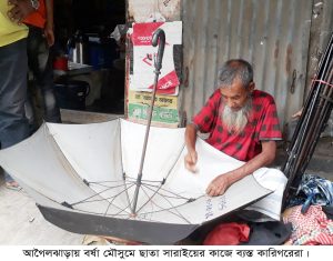 এছাড়াও উপজেলার দেখা গিয়েছে কারিগর আ. মান্নান জানান, আসলে সব সময় খুব একটা কাজ থাকেনা। ছাতা মেরামতের পাশাপাশি তালা চাবি ও লাইট মেরামতের কাজ করছেন। বর্ষা মৌসুম আসায় ফলে লাগাতার বৃষ্টিপাত হওয়ায় কাজের চাপ বেড়ে যাচ্ছে। প্রত্যেকটি জিনিসপত্রের দাম বেড়েছে। ফলে ছাতার কাপড়, হাতল, স্প্রিং, কামান প্রভৃতি জিনিসপত্র কিনতে হচ্ছে চড়া দামে। কিন্তু সেই অনুযায়ী কাজের মজুরী তেমন বাড়েনি।