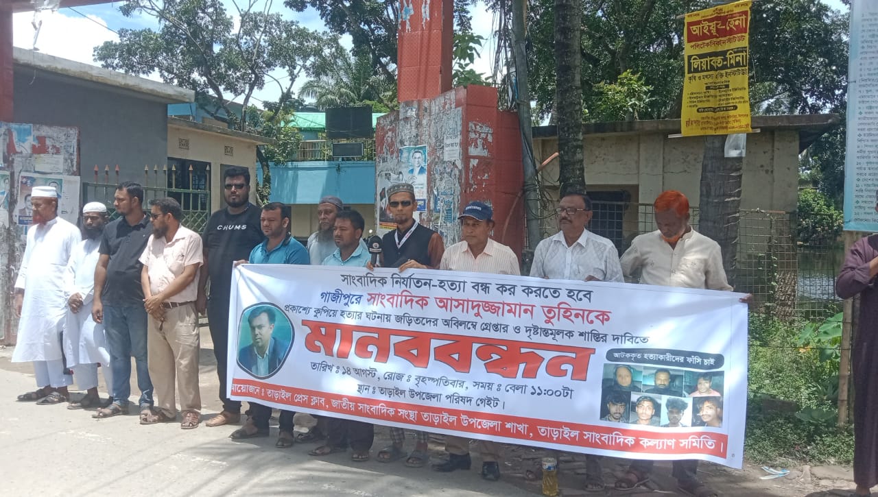 দৈনিক প্রতিদিনের কাগজের সাংবাদিক আসাদুজ্জামান তুহিনকে গাজীপুরে কুপিয়ে ও গলা কেটে হত্যার ঘটনায় সকল অপরাধীদের দ্রুত গ্রেফতার ও বিচারের দাবিতে কিশোরগঞ্জের তাড়াইল উপজেলায় মানববন্ধন করেছে তাড়াইলের সাংবাদিক বৃন্দ।
