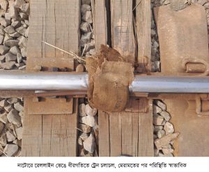 নাটোরের বাগাতিপাড়া উপজেলার লোকমানপুর রেলস্টেশন সংলগ্ন এলাকায় রেললাইন ভেঙে যাওয়ায় কয়েক ঘণ্টা ধরে ট্রেন ধীর গতিতে চলাচল করে। তবে দ্রুত মেরামতের পর ট্রেন চলাচল এখন স্বাভাবিক রয়েছে।মঙ্গলবার সকাল সাড়ে ৬টার দিকে নিয়মিত পর্যবেক্ষণের সময় রেলের কর্মীরা লাইনে ফাটল দেখতে পান। এ সময় সাময়িকভাবে ভাঙা জায়গায় পাটের বস্তা গুঁজে দেওয়া হয়। এর মাধ্যমে সর্বোচ্চ ১০ কিলোমিটার গতিতে ট্রেন চলাচলের অনুমতি দেওয়া হয়। এ সময়ে কমিউটার ও ঢালারচর এক্সপ্রেসসহ কয়েকটি ট্রেন ওই ভাঙা লাইনের ওপর দিয়েই ধীর গতিতে চলাচল করে। আব্দুলপুর রেলওয়ে স্টেশন মাস্টার মোস্তাফিজুর রহমান বলেন, ‘আমাদের কর্মীরা ফাটল শনাক্ত করার পরপরই ব্যবস্থা নেয়। মেরামতকাজ দ্রুত সম্পন্ন হয়েছে।’ রেলওয়ে পশ্চিমাঞ্চলের মহাব্যবস্থাপক ফরিদ আহমেদ বলেন, ‘রেললাইন পুরোনো হয়ে যাওয়ার কারণে এ ঘটনা ঘটেছে। তবে এটি কোনো নাশকতা নয়। কয়েক ঘন্টা ধীর গতিতে ট্রেন চলাচল করে। মেরামত শেষে এখন ট্রেন স্বাভাবিকভাবে চলছে।’