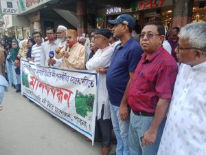 মঙ্গলবার ২৬ আগস্ট সকাল দশটায় ঐতিহ্যবাহী পাবনা প্রেসক্লাবের সামনে ঘন্টা ব্যাপী এ মানববন্ধনে প্রধান অতিথির বক্তব্য দেন পাবনা জেলা বিএনপির প্রতিষ্ঠাতা সভাপতি , ইছামতি নদী উদ্ধার আন্দোলন পাবনার উপদেষ্টা বিশিষ্ট শিক্ষাবিদ অধ্যক্ষ ( অব.) আলহাজ¦ মাহাতাব উদ্দিন বিশ^াস।