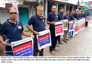 অধিকার কর্মসংস্থান ন্যায়বিচার গণতন্ত্র এবং একটি পরিপূর্ণ জীবনের জন্য একটি নিরাপদ পৃথিবীতে বৈষম্য, স্বৈরাচার, গণহত্যা, ধ্বংস ও বিশৃঙ্খলার বিরুদ্ধে পাবনার চাটমোহরে অনুষ্ঠিত হয়েছে অবস্থান কর্মসূচি ও মানববন্ধন। গত শুক্রবার (১৯ সেপ্টেম্বর) সকালে চাটমোহর প্রেসক্লাবের সামনের সড়কে ধরিত্রী রক্ষায় আমরা (ধরা) এর সহযোগিতায় চলনবিল রক্ষায় আমরা, চাটমোহর প্রেসক্লাব ও চিকনাই নদী রক্ষায় আমরা’র উদ্যোগে এই কর্মসূচি পালিত হয়। চলনবিল রক্ষায় আমরা’র আহবায়ক ও চাটমোহর প্রেসক্লাবের সভাপতি হেলালুর রহমান জুয়েলের সভাপতিত্বে অনুষ্ঠিত অবস্থান কর্মসূচিতে বক্তব্য দেন, চলনবিল রক্ষায় আমরার সমন্বয়কারী মো.জাগাঙ্গীর আলম, চিকনাই নদী রক্ষায় আমরার সদস্য সচিব খলিলুর রহমান, সাংবাদিক ও লেখব সহকারী অধ্যাপক ইকবাল কবীর রঞ্জু, শিক্ষক ও প্রেসক্লাবের সহ সম্পাদক মো. নুরুল ইসলাম, মো. ইশারত আলী প্রমূখ।