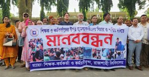 রাজশাহী বিশ্ববিদ্যালয়ের (রাবি) উপ-উপাচার্য (প্রশাসন) মাঈন উদ্দিনসহ তিন শিক্ষককে যারা লাঞ্ছিত করেছেন, তাদের ছাত্রত্ব বাতিলের দাবিতে কমপ্লিট শাটডাউন ঘোষণা করে মানববন্ধন করেছেন শিক্ষক-কর্মকর্তারা। গতকাল সোমবার (২২ সেপ্টেম্বর) বেলা ১১টার দিকে বিশ্ববিদ্যালয়ের প্যারিস রোডে এ কর্মসূচি পালন করেন তারা। একইসঙ্গে তারা এখনও কীভাবে আসন্ন রাকসু নির্বাচনে প্রার্থীতা করার সুযোগ পাচ্ছেন, সে প্রশ্নও তুলেছেন শিক্ষকেরা। অধ্যাপক মাঈন উদ্দিনসহ তিন শিক্ষক-কর্মকর্তাকে লাঞ্ছিত করার প্রতিবাদে সোমবার সকালে বিশ্ববিদ্যালয়ের প্যারিস রোডে মানববন্ধনের আয়োজন করেন শিক্ষক-কর্মকর্তারা। মানববন্ধন থেকেই বক্তারা অভিযুক্ত শিক্ষার্থীদের ‘সন্ত্রাসী’ অ্যাখা দিয়ে ছাত্রত্ব বাতিলের দাবি জানান। মানবন্ধনে শিক্ষক-কর্মকর্তারা বলেন, শনিবার (২০ সেপ্টেম্বর) বিশ্ববিদ্যালয়ে যে ঘটনা ঘটেছে তা বিশ্ববিদ্যালয়ের ইতিহাসে আগে ঘটেনি। আমরা এ ঘটনার বিচার না হওয়া পর্যন্ত আমাদের অবস্থান থেকে সরবো না। বক্তারা বলেন, বিশ্ববিদ্যালয়ের বর্তমান শিক্ষার্থীদের পাশাপাশি তাদের সঙ্গে কিছু সাবেক শিক্ষার্থীকেও দেখা যাচ্ছে। শিক্ষক-কর্মকর্তাদের ওপর হামলার জন্য বর্তমান ছাত্র নামধারী সন্ত্রাসীদের ছাত্রত্ব বাতিল করতে হবে। আর সাবেক শিক্ষার্থীদের সনদ বাতিল করতে হবে। যারা শিক্ষকের গায়ে হাত তুলতে পারে, তারা ছাত্র নয়। তারা সন্ত্রাসী। এদের কয়েকজন আবার রাকসু নির্বাচনের প্রার্থী। নির্বাচন কমিশনের কাছে আমার প্রশ্ন, প্রকাশ্যে এমন সন্ত্রাসী কার্যকলাপের পরেও তারা কীভাবে নির্বাচনে প্রার্থীতা করতে পারে? অবিলম্বে তাদের প্রার্থীতা বাতিল করতে হবে। পাশাপাশি তাদের ছাত্রত্ব বাতিল করতে হবে। উল্লেখ্য, রাবিতে কর্মরতদের সন্তানদের ভর্তির জন্য আগে থেকেই ৪ শতাংশ পোষ্য কোটা ছিল। শিক্ষার্থীদের আন্দোলনের মুখে এ কোটা বাতিল হলে শিক্ষক, কর্মকর্তা ও কর্মচারীরা তা বহালের জন্য আন্দোলন করে আসছিলেন। সবশেষ গত ১৭ সেপ্টেম্বর তারা জানিয়ে দেন, দাবি আদায় না হলে ২১ সেপ্টেম্বর থেকে অনির্দিষ্টকালের জন্য কর্মবিরতিতে যাবেন তারা। ফলে গত ১৮ সেপ্টেম্বর জরুরি অ্যাকাডেমিক কমিটির সভা হয়।#