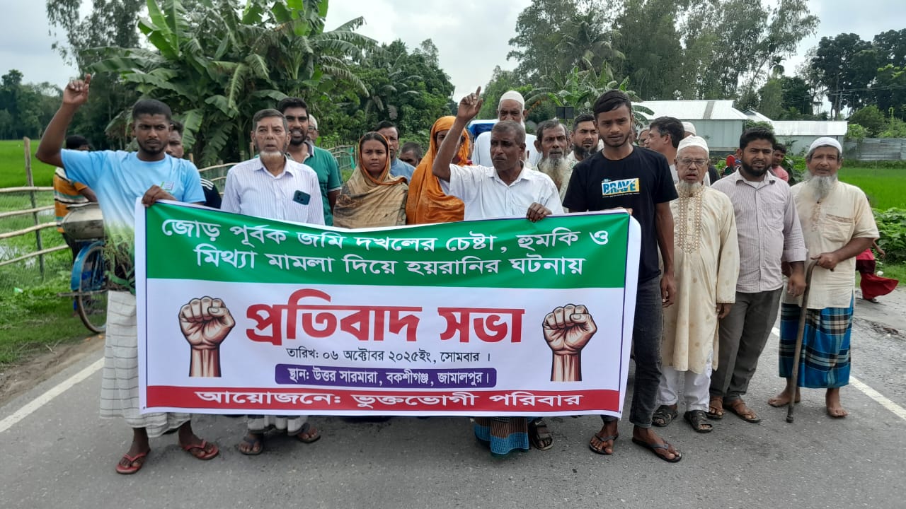 জামালপুরের বকশীগঞ্জে জোরপূর্বক জমি দখলের চেষ্টা ও মিথ্যা মামলা দিয়ে হয়রানির ঘটনায় বিক্ষোভ মিছিল ও প্রতিবাদ সভা অনুষ্ঠিত হয়েছে। সোমবার (৬ অক্টোবর) সকালে বগারচর ইউনিয়নের উত্তর সারমারা খেয়াঘাট বাজার এলাকায় বিক্ষোভ মিছিল ও প্রতিবাদ সভা অনুষ্ঠিত হয়।