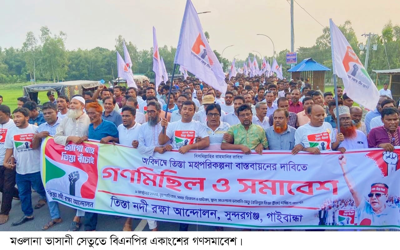‘জাগো বাহে তিস্তা বাঁচাই’ এই প্রতিপাদ্যকে সামনে রেখে অবিলম্বে তিস্তা মহাপরিকল্পনা বাস্তবায়নের দাবিতে মওলানা ভাসানী সেতুতে বিএনপির একাংশের গণসমাবেশ ও গণমিছিল অনুষ্ঠিত হয়েছে।