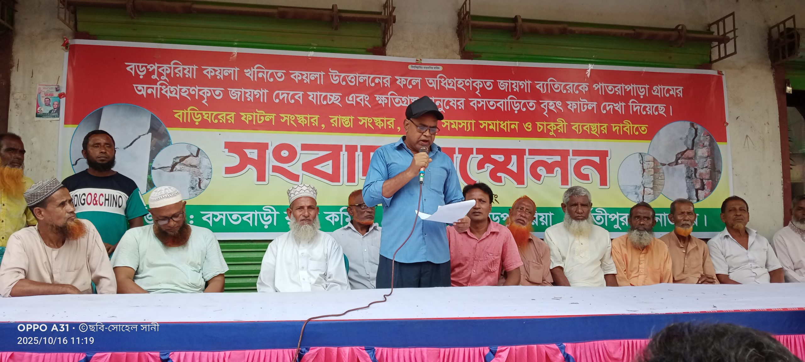 পার্বতীপুরের হামিদপুর ইউনিয়নের পাতরাপাড়ায় বড়পুকুরিয়া খনি কয়লা উত্তোলনের কারণে পাতরাপাড়া গ্রামের বসতবাড়ি কম্পন, ধস ও ফেটে যাওয়ায় পাতরাপারা বসতবাড়ি রক্ষা কমিটি সংবাদ সম্মেলন করেছে।