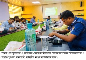 বেনাপোল কাস্টম হাউসের কমিশনার খালেদ মোহাম্মদ আবু হোসেনের সভাপতিত্বে অনুষ্ঠিত সভায় কাস্টমস ও স্থলবন্দর সংলগ্ন এলাকার নিরাপত্তা জোরদার, আমদানি-রপ্তানি পণ্যের সংরক্ষণ, আন্তর্জাতিক চেকপোস্টের নিরাপত্তা জোরদার, অননুমোদিত প্রবেশ প্রতিরোধ এবং আইন-শৃঙ্খলা পরিস্থিতি উন্নয়নের বিষয়গুলো গুরুত্বের সঙ্গে আলোচনা করা হয়।
