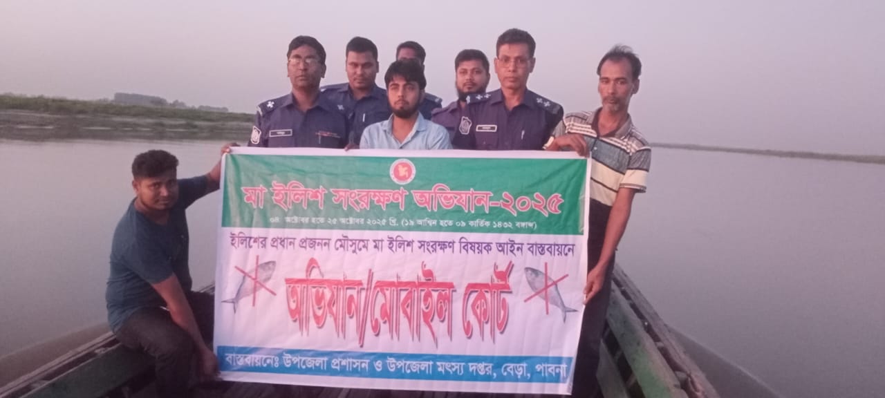 সংরক্ষণে সরকার ঘোষিত নিষেধাজ্ঞা কার্যকর করতে সারাদেশের মতো পাবনার বেড়া উপজেলায়ও চলছে ব্যাপক অভিযান। মা ইলিশ ধরা, পরিবহন, মজুত ও বিক্রি রোধে উপজেলা প্রশাসনের পক্ষ থেকে নিয়মিতভাবে নদী তীরবর্তী এলাকায় পরিচালিত হচ্ছে মোবাইল কোর্ট। মঙ্গলবার রাতে উপজেলার যমুনা নদীর বিভিন্ন অংশে মোবাইল কোর্ট পরিচালনা করেন বেড়া উপজেলা নির্বাহী অফিসার মো.মোরশেদুল ইসলাম।বেড়া উপজেলা মৎস্য কর্মকর্তাএ প্রতিবেদককে জানান চলমান অভিযানে ভ্রাম্যমাণ আদালত মোবাইল কোর্টের মাধ্যম ঘটনার দিন রাতে ৪ জন জেলকে ২০ হাজার টাকা জরিমানা করে আইনি হেফাজতে নেওয়া হয়। আটককৃত জেলেদের থেকে উদ্ধারকৃত ৩০ হাজার টাকার প্রায় ২ হাজার মিটার কারেন্ট জাল জব্দ করে জনসম্মুখে পুড়িয়ে ধ্বংস করা হয়েছে এবং উদ্ধারকৃত মাছ নিকটস্থ এতিমখানা বিতরণ করা হয়েছে।