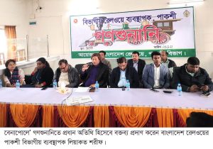 বেনাপোল রেলওয়ে স্টেশন মাস্টার আয়নাল হাসানের সভাপতিত্বে আয়োজিত গণশুনানিতে প্রধান অতিথি হিসেবে উপস্থিত ছিলেন পাকশী বিভাগীয় রেলওয়ে ব্যবস্থাপক লিয়াকত শরীফ।