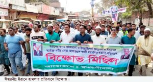 সোমবার (২ মার্চ) দুপুরে শহরের রেলওয়ে গেটস্থ বাসটার্মিনাল জামে মসজিদ প্রাঙ্গণ থেকে বিক্ষোভ মিছিলটি শুরু হয়ে স্টেশন রোড প্রদক্ষিণ করে ঈশ্বরদী বাজারের প্রধান ফটকে গিয়ে শেষ হয়। ‘ঈশ্বরদী বাসী’ ব্যানারে আয়োজিত এ কর্মসূচিতে উপজেলার বিভিন্ন শ্রেণি-পেশার মানুষ অংশগ্রহণ করেন।